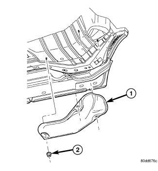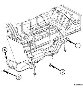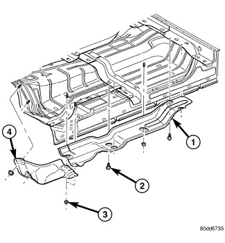 2. Remove the nuts (3) or bolts (2) holding the exhaust heat shield (1) to the floor pan(Figure 1)(Figure 2)(Figure 3), crossmember or bracket.