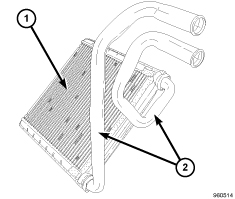 The heater core (1) is a heat exchanger made of rows of tubes and fins and is located at the front of the HVAC housing. The heater core tubes (2) are attached to the front of the heater core and are secured to the HVAC housing by a flange.