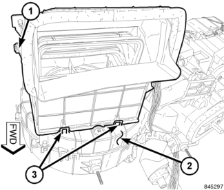 4. Carefully disengage the two retaining tabs (3) that secure the front of the air inlet housing (1) to the top of the HVAC housing (2) and remove the inlet housing.