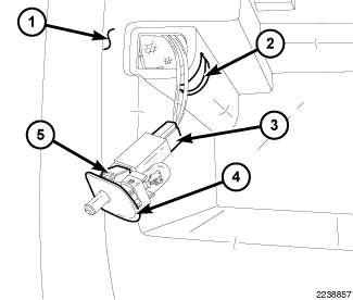 3. Reach through the window (2) in the upper glove box bin (1) forward of the glove box lamp and switch unit (4) to access and depress one of the retaining latches (5) on the top or the bottom of the switch housing.