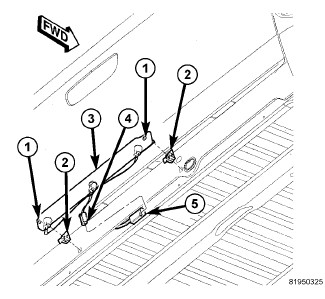 2. Reach under and behind the rear bumper near the center to access and disconnect the tailgate marker lamp (3) pigtail wire connector (4) from the wire harness connector (5).