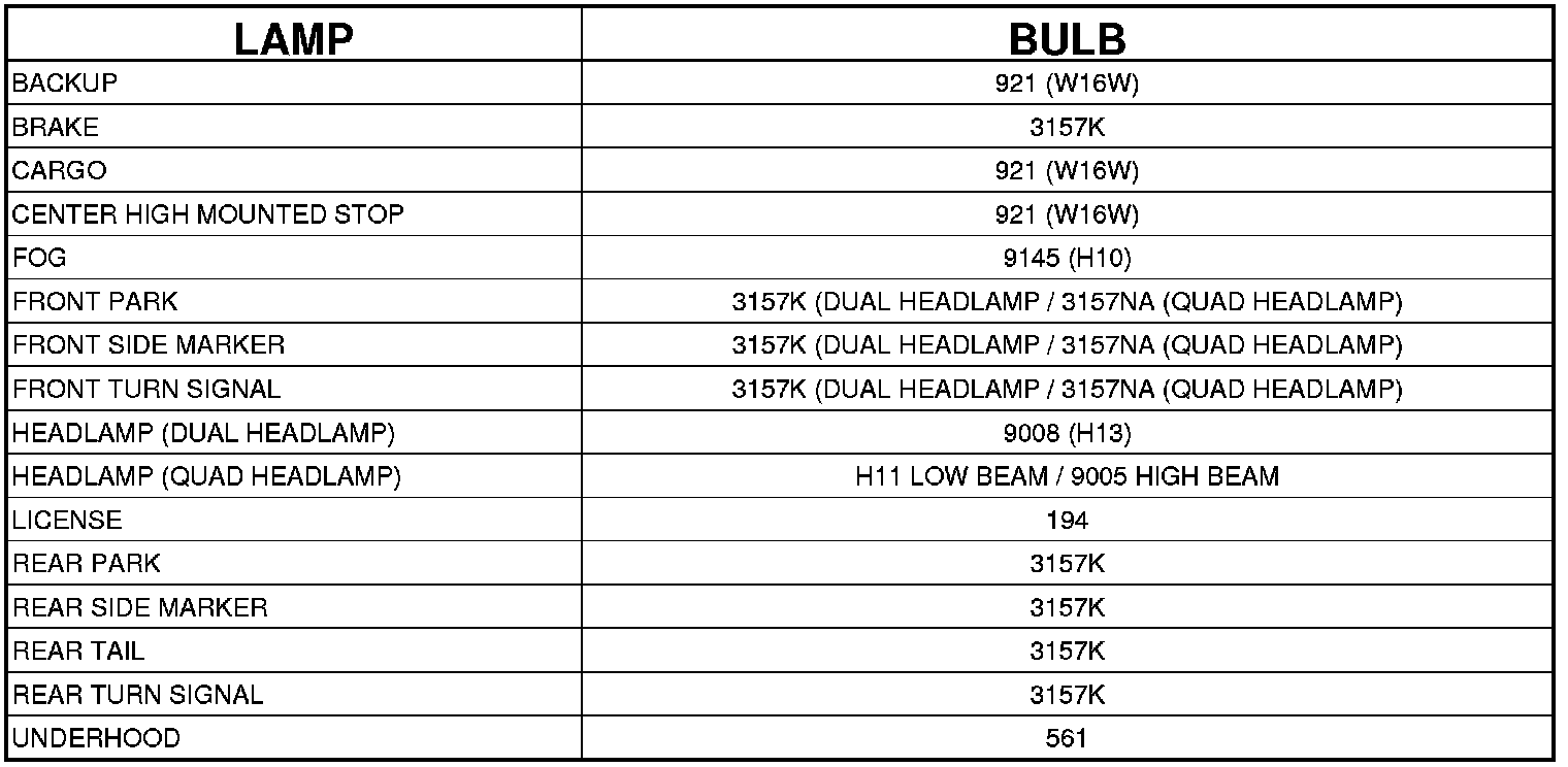 BULB APPLICATION TABLE
