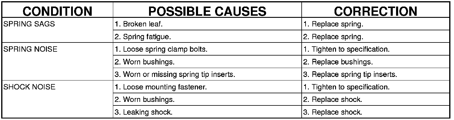 If the vehicle is used for severe, off-road operation, the springs should be examined periodically. Check for broken and shifted leafs, loose and missing clips, and broken center bolts. Refer to Spring and Shock Absorber Diagnosis chart for additional information.