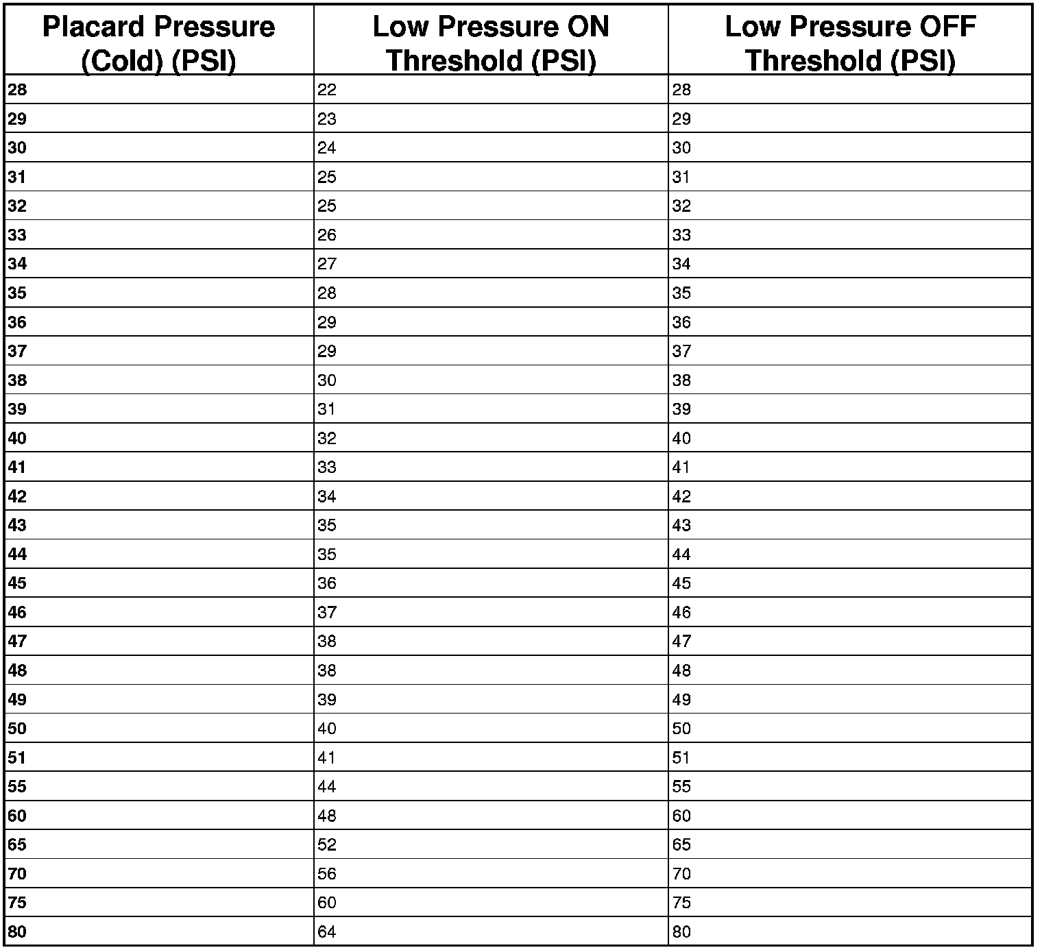 To determine the pressure thresholds for a vehicle, refer to the Tire Inflation Pressure (Placard) Label, and then apply the placard pressure to the following table. The Low Pressure OFF Threshold is defined as the Low Pressure ON Threshold plus the Hysteresis Pressure value.