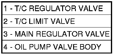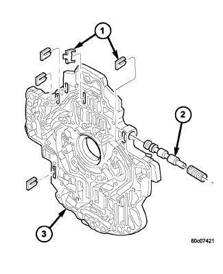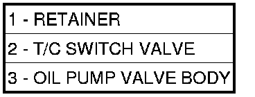 1. Lubricate the oil pump valves with Mopar(R) ATF +4 and install the TCC Switch Valve (2), spring, and retainer (1) into the appropriate oil pump valve body (3) bore.