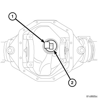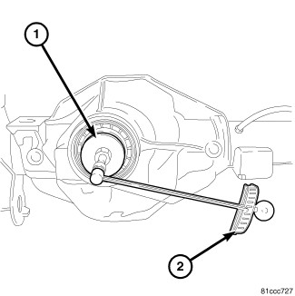 4. Measure pinion torque to rotate (1) with and inch pound torque wrench (2). Pinion torque to rotate is: 5 - 8 Nm (44 - 70 in. lbs.).