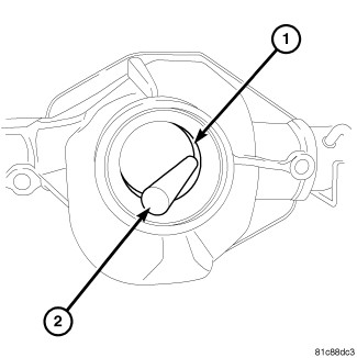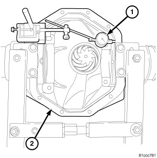 1. Position the dial indicator (1) plunger against a ring gear tooth (2).