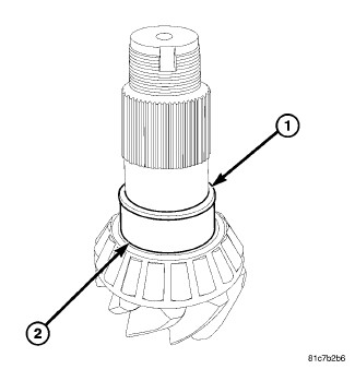 Pinion torque to rotate/pinion bearing preload is achieved using a select shim (1). The shim is located on the pinion shaft on top of the spacer (2). Pinion preload shims thickness will change with pinion depth shim change.