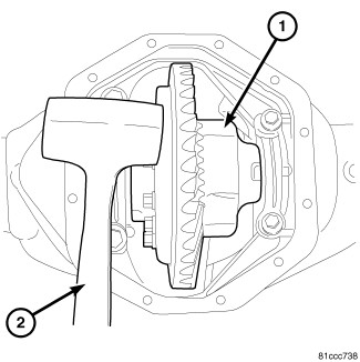 17. Seat differential dummy bearing to the ring gear side (1) of the housing with a dead-blow hammer (2).