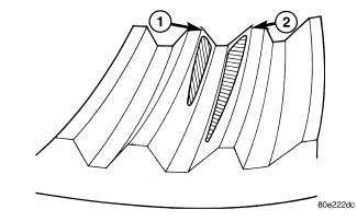 Ring gear too close to pinion gear, drive side toe (1) coast side toe (2). Increase backlash, by moving the ring away from the pinion gear using the adjusters.