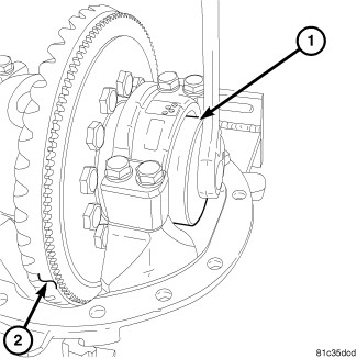 5. Mark first indicator mark on the bearing cap (2). Rotate adjuster counter clockwise until the third indicator mark is aligned with the bearing cap mark (2).