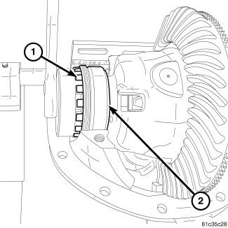3. Turn ring gear side adjuster clockwise with Adjuster (1) until ring gear (2) contacts the pinion gear to achieve zero lash.