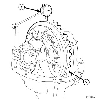 1. Measure radial runout with dial indicator (1) plunger on top of the ring gear (2). Rotate ring gear and record the highest reading. Radial runout should not exceed 0.25 mm (0.01 in.).
