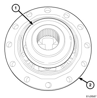 10. Align ring gear (1) to differential case with two ring gear bolts (2).