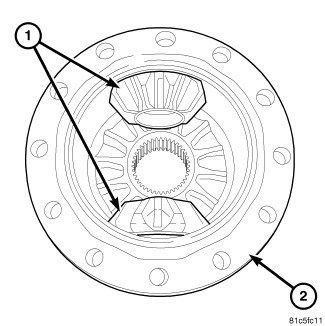 3. Install a set of pinion gears (1) with thrust washer into differential case (2).