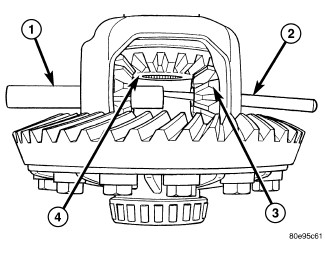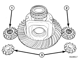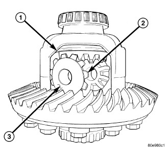 3. Rotate differential pinion gears (2) to differential window (1) and remove pinion gears and thrust washers (3).