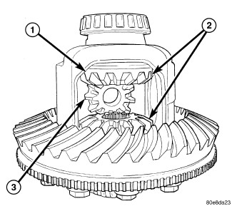 3. Install first pinion gear (3) into the differential window (1) and side gears (2). Rotate the pinion gear to the back of the case.