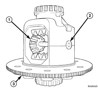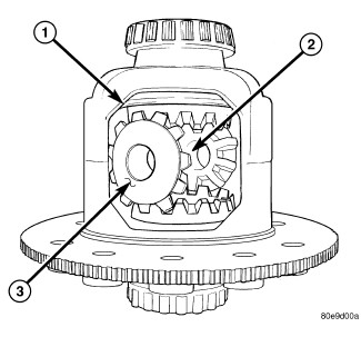 3. Rotate one pinion gear (2) with thrust washer (3) to the differential window (1) and remove the gear.