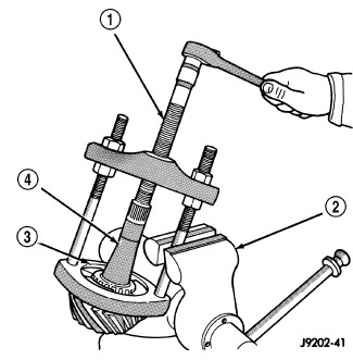 14. Remove rear pinion bearing with Puller (1) and Adapters (4).