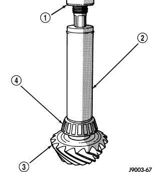 7. Install pinion into housing (2) and place front pinion bearing onto the pinion shaft. Draw pinion shaft into the front bearing with Installer (1).