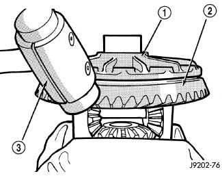 7. Drive ring gear (2) from differential case (1) with a soft hammer (3).