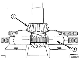 8. Hold pinion flange (1) with Flange Wrench (2) and remove pinion flange nut.