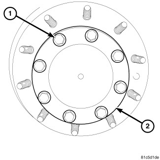 3. Remove axle shaft bolts (1) from axle flange (2).