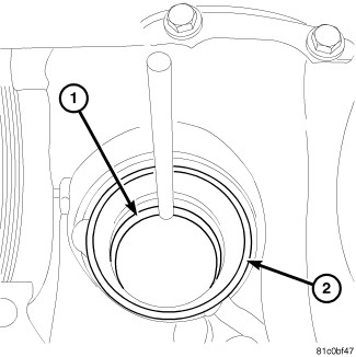 16. Remove front pinion bearing cup (1) from carrier (2) with a hammer and brass drift.