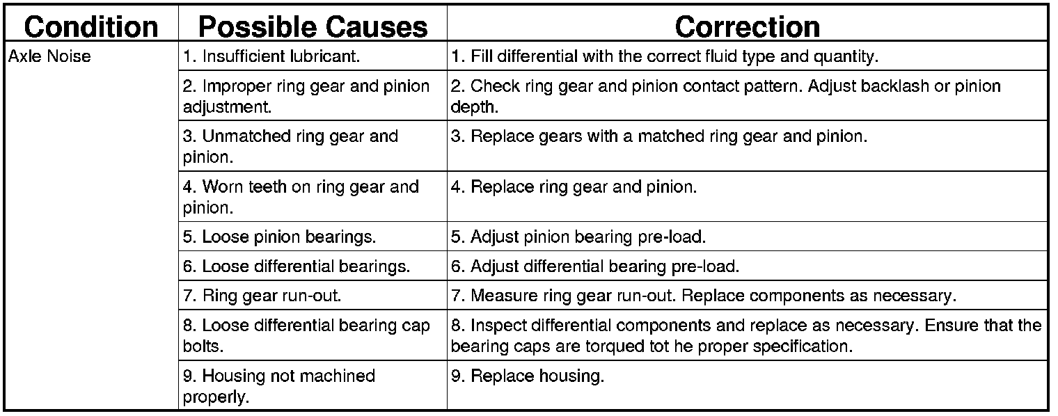 When road testing, first warm-up the axle fluid by driving the vehicle at least 5 miles and then accelerate the vehicle to the speed range where the noise is the greatest. Shift out-of-gear and coast through the peak-noise range. If the noise stops or changes greatly check for: