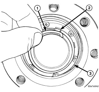 8. Install retainer ring (1) with ring end in the key slot (2).