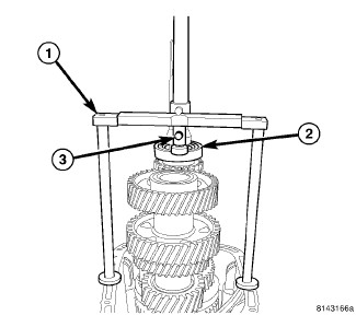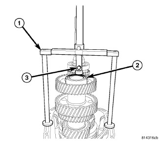3. Loosen the knob (2) on the fixture and lower the shaft onto the countershaft bearing cup (3) bore shoulder. Then tighten the knob to hold the shaft.