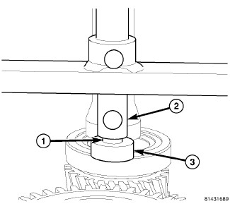 9. Measure the gap (1) between the fixture shaft (2) and the fixture plunger (3). Repeat measurement on the opposite side of the mainshaft cup and bearing. The average of the two measurement, will be the size of the mainshaft select shim.