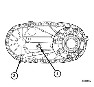 The fill (1)(Figure 1) and drain (2) plugs are both in the rear case.