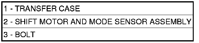 3. Remove the bolts (3) holding the shift motor and mode sensor assembly (2) onto the transfer case (1).