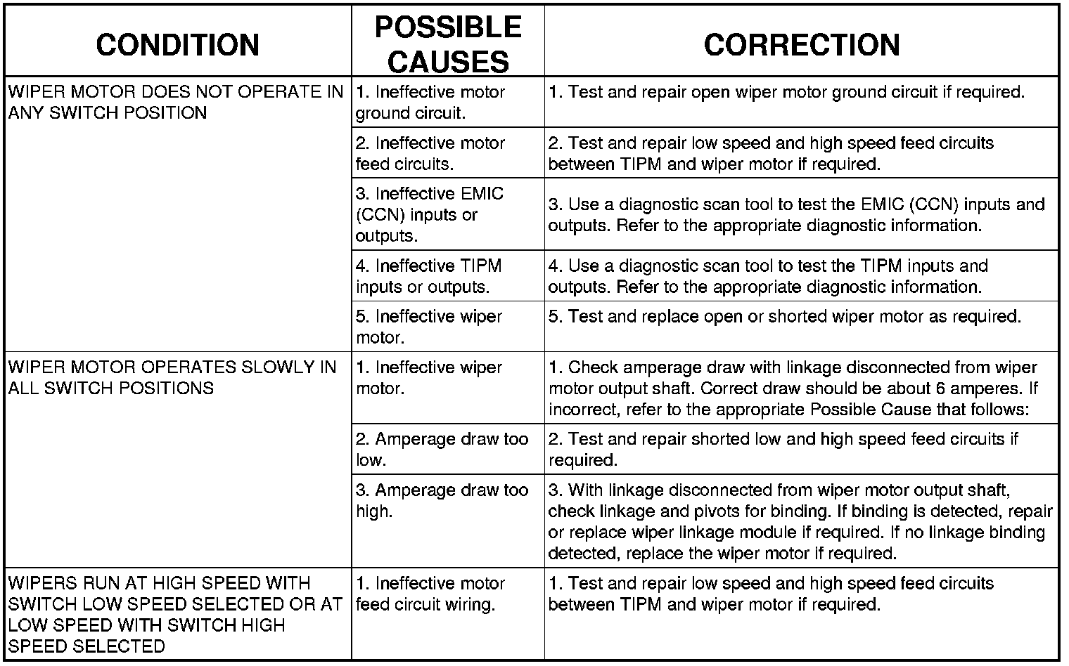 If the wiper motor operates, but the wipers do not move on the windshield, replace the ineffective wiper linkage module. If the washer pump/motor operates, but no washer fluid is dispensed on the glass; or, if the wipers operate, but chatter, lift, or do not clear the glass, clean and inspect the wiper and washer system components as required. Wipers And Washers - Cleaning and Wipers And Washers - Inspection.
