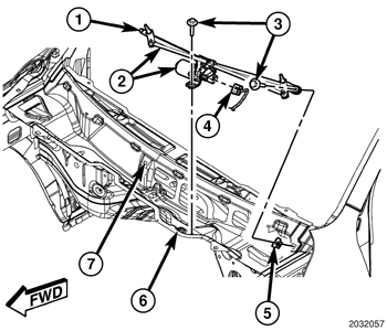 3. Lift the left end of the wiper linkage module upward out of the cowl plenum far enough to engage the rubber insulated tab (1) on the outboard end of the right pivot bracket into the slot (7) in the cowl plenum.
