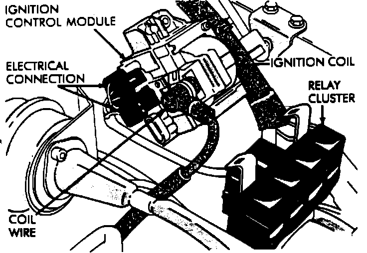 The ignition control module is mounted together with the ignition coil, on the inner fender next to the relay cluster.