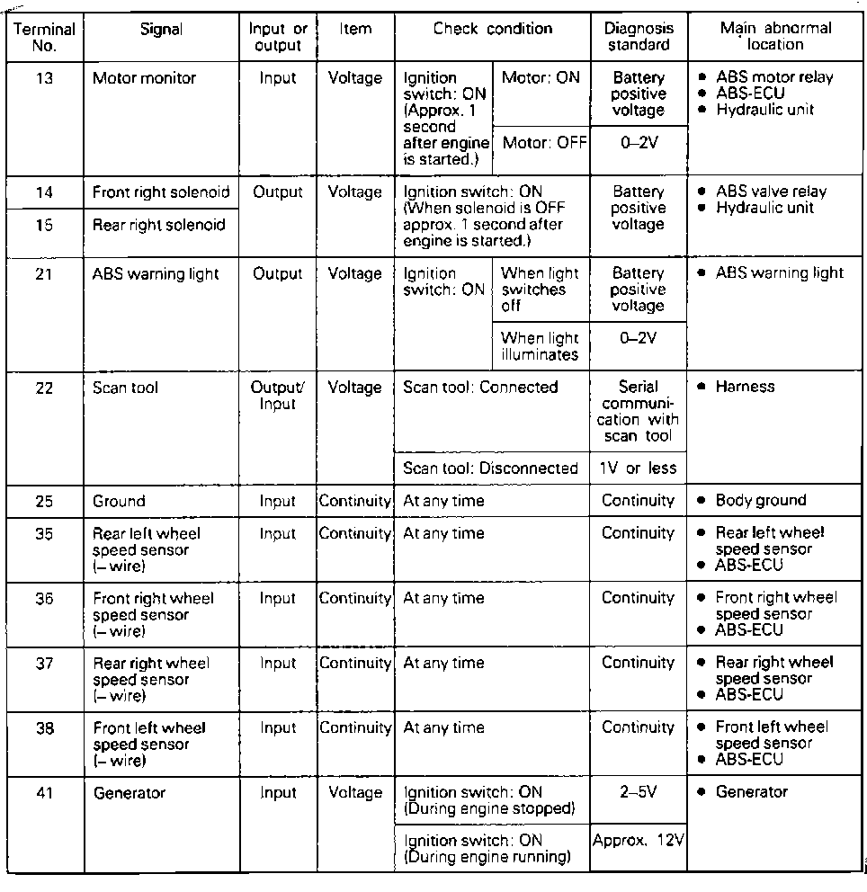 2. With the ABS ECU connector connected, check voltage and continuity between each terminal and ground when ignition is the On position as shown.