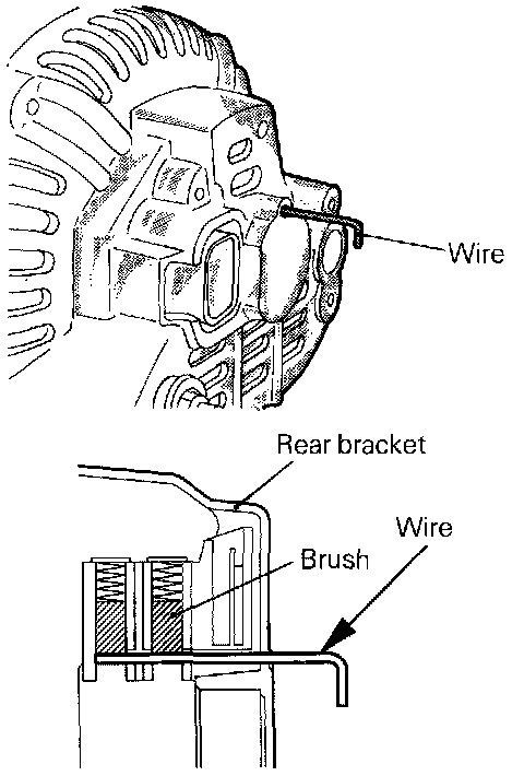 is attached to rear bracket, insert wire through small hole made in rear bracket to lift brush. After rotor has been installed, remove the wire.