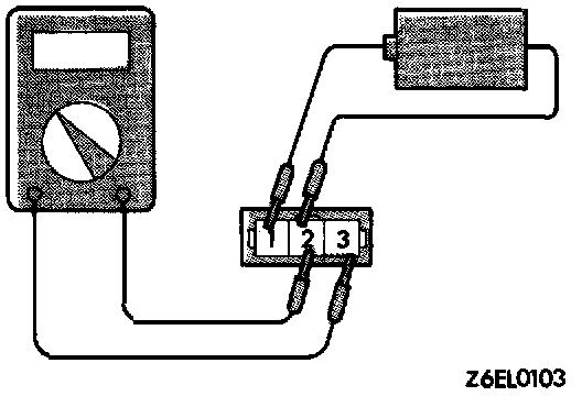 1. Connect the negative (-) terminal of the 1.5 V power supply to terminal (2) of the ignition power transistor; then check whether there is continuity between terminal (3) and terminal (2) when terminal (1) and the positive (+) terminal are connected and disconnected.