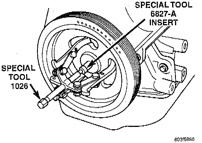 3. Remove crankshaft damper bolt. Remove damper using the large side of Special Tool 1026 and insert 6827-A. or equivalents.