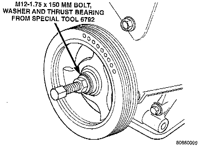 1. Install crankshaft damper using M12-1.75 x 150 mm bolt, washer, thrust bearing and nut from Special Tool 6792, or equivalent. Install crankshaft damper bolt and tighten to 142 Nm (105 ft. lbs.).