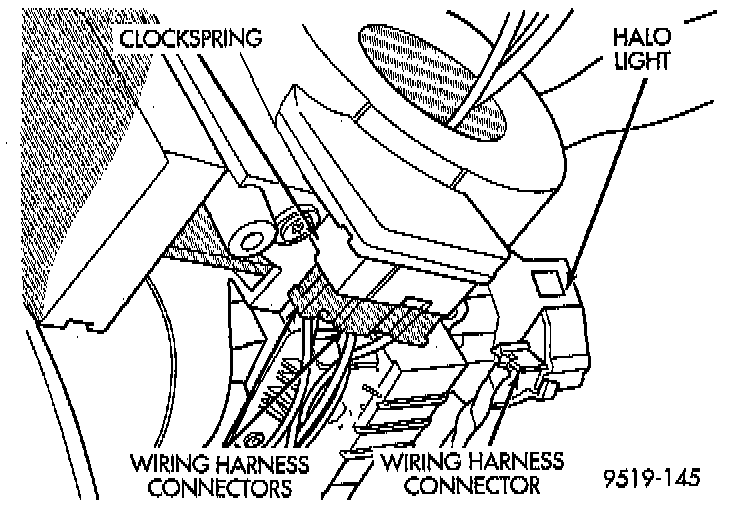 18. Remove the 2 wiring harness connectors from the clockspring. Then remove wiring harness connector from lock housing halo light.