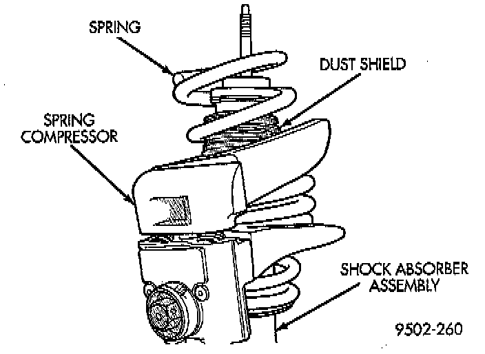 13. Relieve all tension from spring compressor. After all spring tension has been remove from the spring compressor, remove it from the shock absorber assembly.