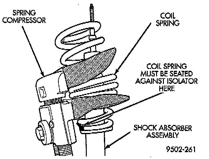 5. Install the coil spring (with small diameter coils down) on the shock absorber assembly. Be sure bottom coil of spring is correctly positioned on the lower spring isolator.