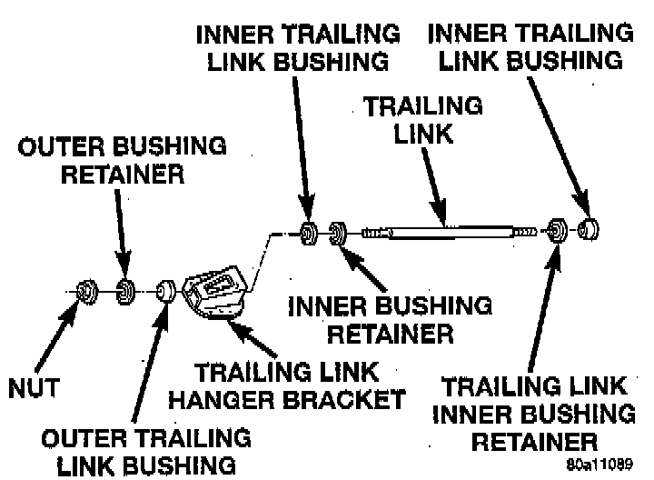 1. Install the inner bushing retainer, and inner bushing on the trailing link. Install the trailing link, retainer and bushing on the hanger bracket. Then install the outer bushing, outer bushing retainer and nut on the trailing link. Tighten the trailing link retaining nut to a torque of 99 Nm (73 ft. lbs.).