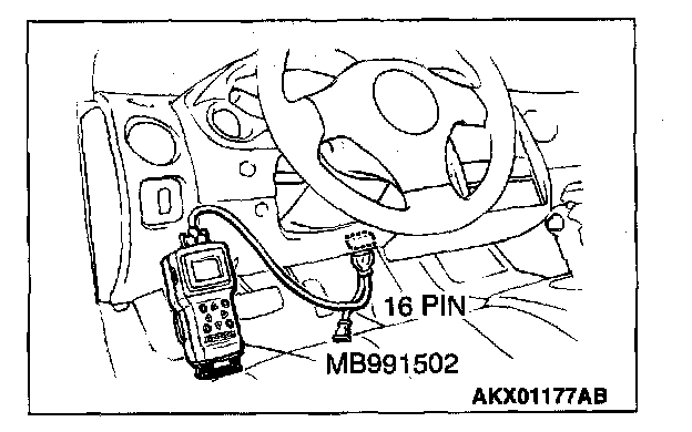 CAUTION: To prevent damage to scan tool MB991502, always turn the ignition switch to the "LOCK" (OFF) position before connecting or disconnecting scan tool MB991502.