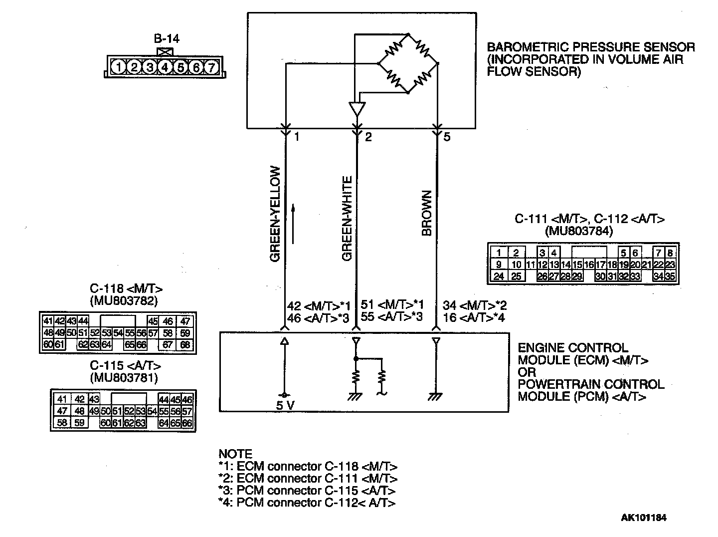 - A 5-volt voltage is supplied to the barometric pressure sensor power terminal (terminal 1) from the ECM (terminal 42)