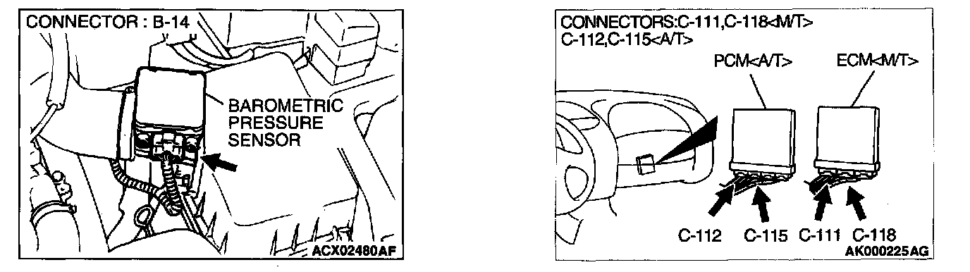 STEP 3. Check connector B-14 at the barometric pressure sensor and connector C-118 at ECM