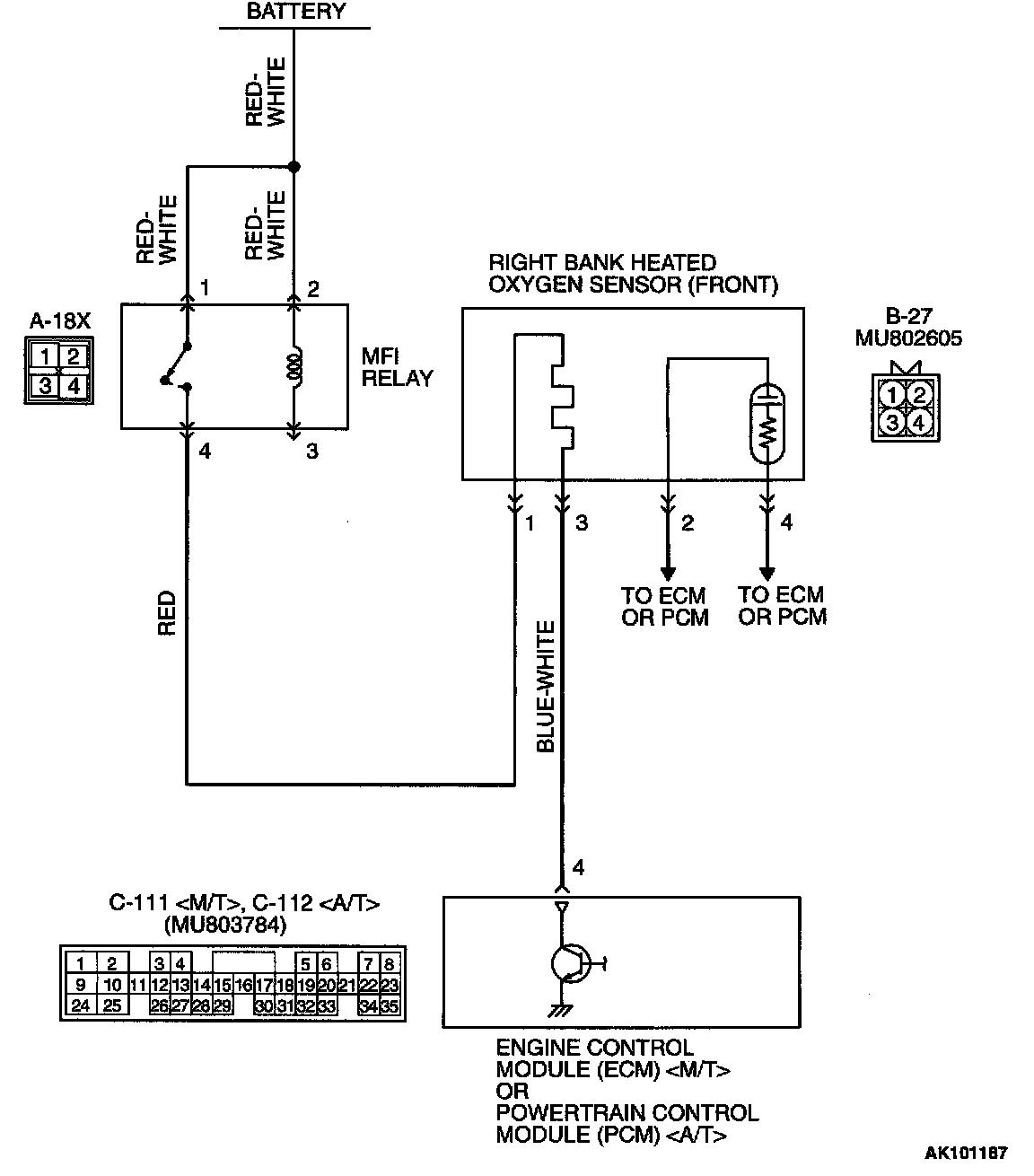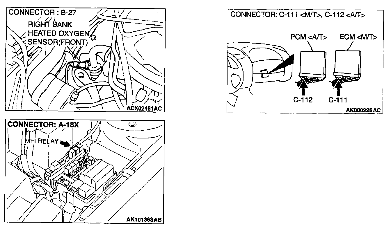 STEP 9. Check for harness damage between MFI relay connector A-18X terminal 4 and right bank heated oxygen sensor (front) connector B-27 terminal 1.